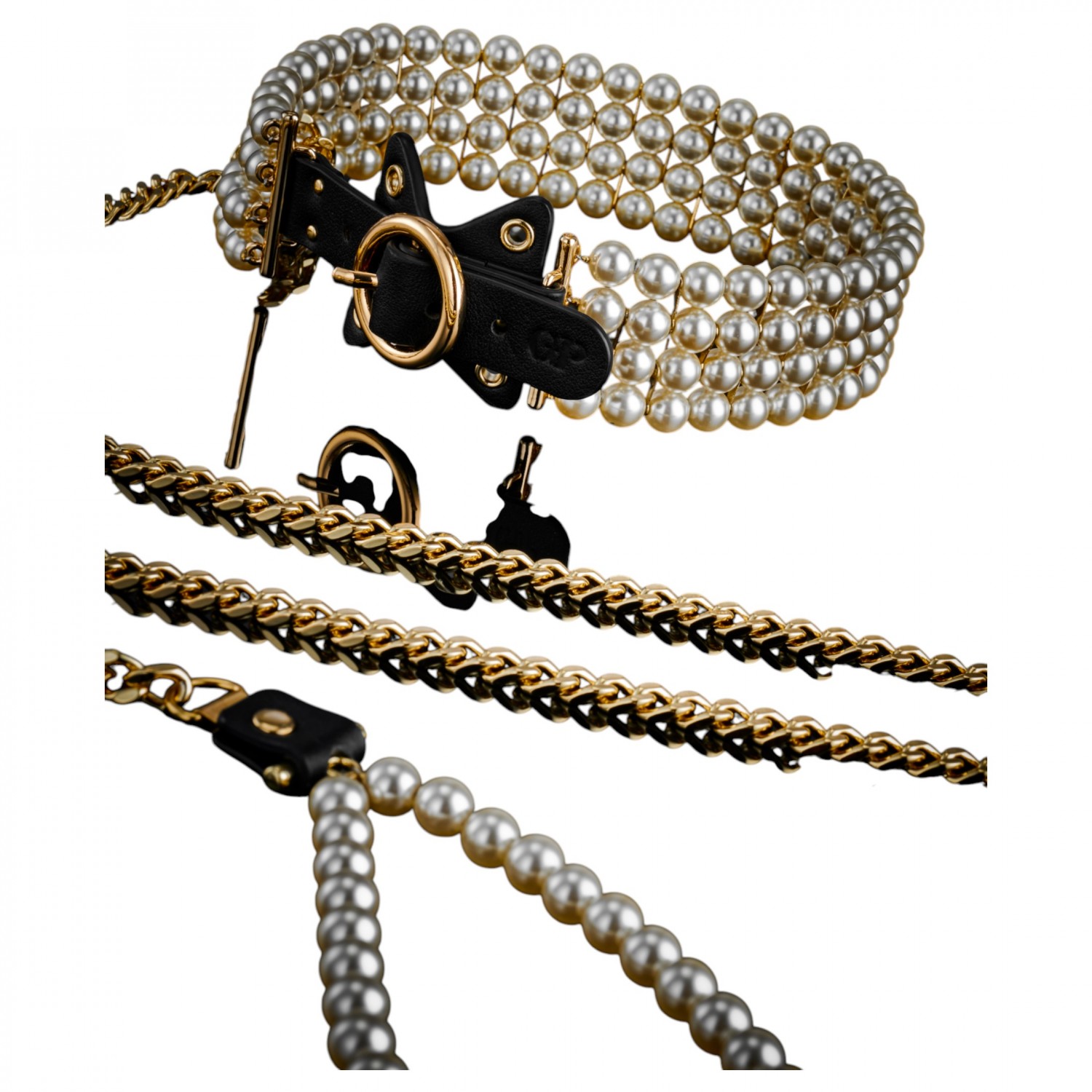 Szín: fekete nyakörv, gyöngyös póráz, arany tónusú fémrészek