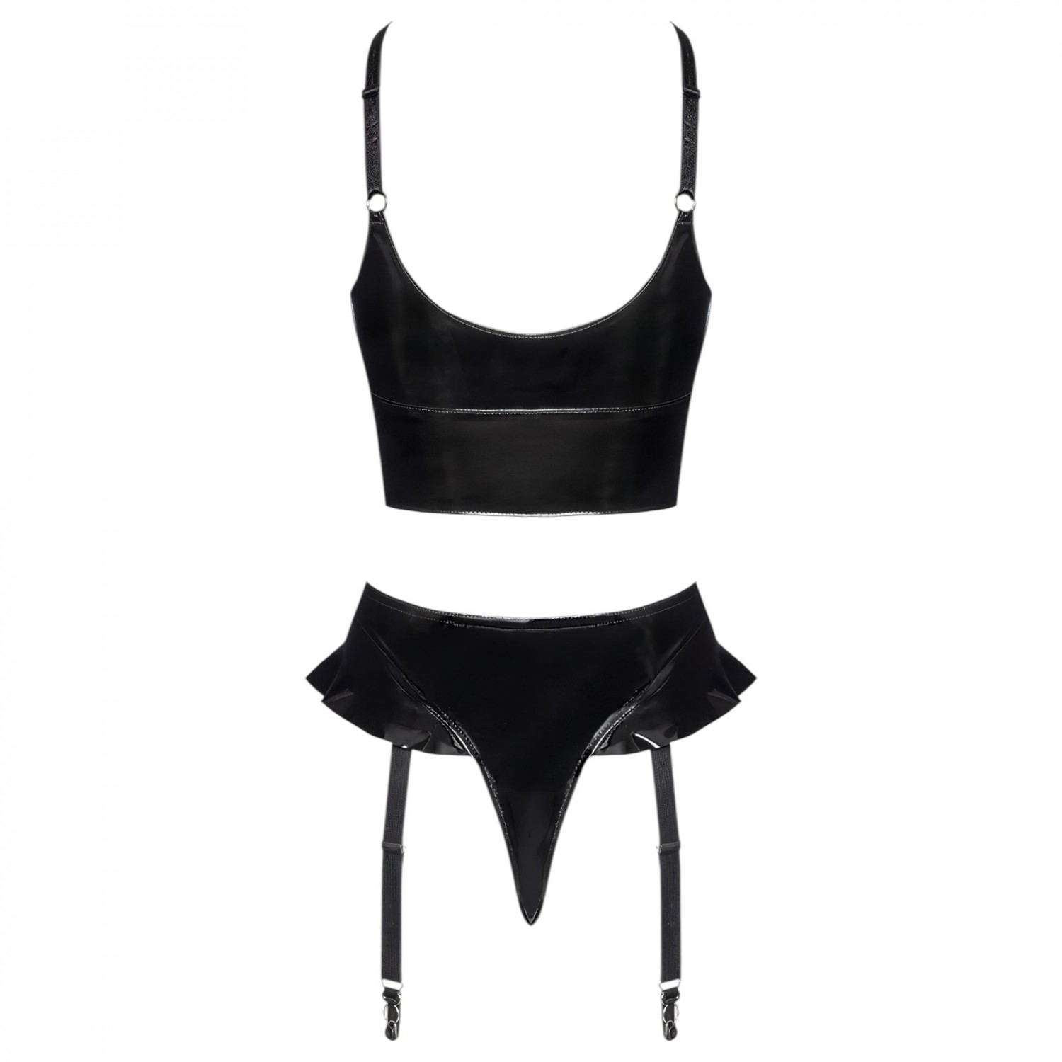 1 darab vinyl tanga állítható, levehető harisnyatartó pántokkal és frill díszítéssel