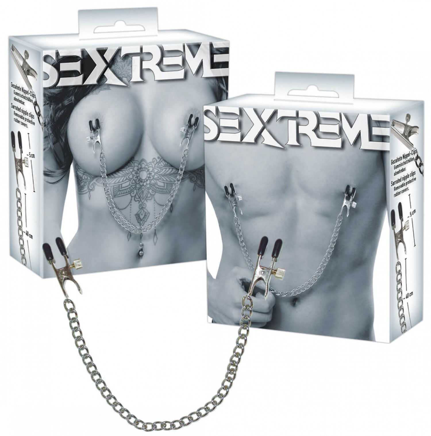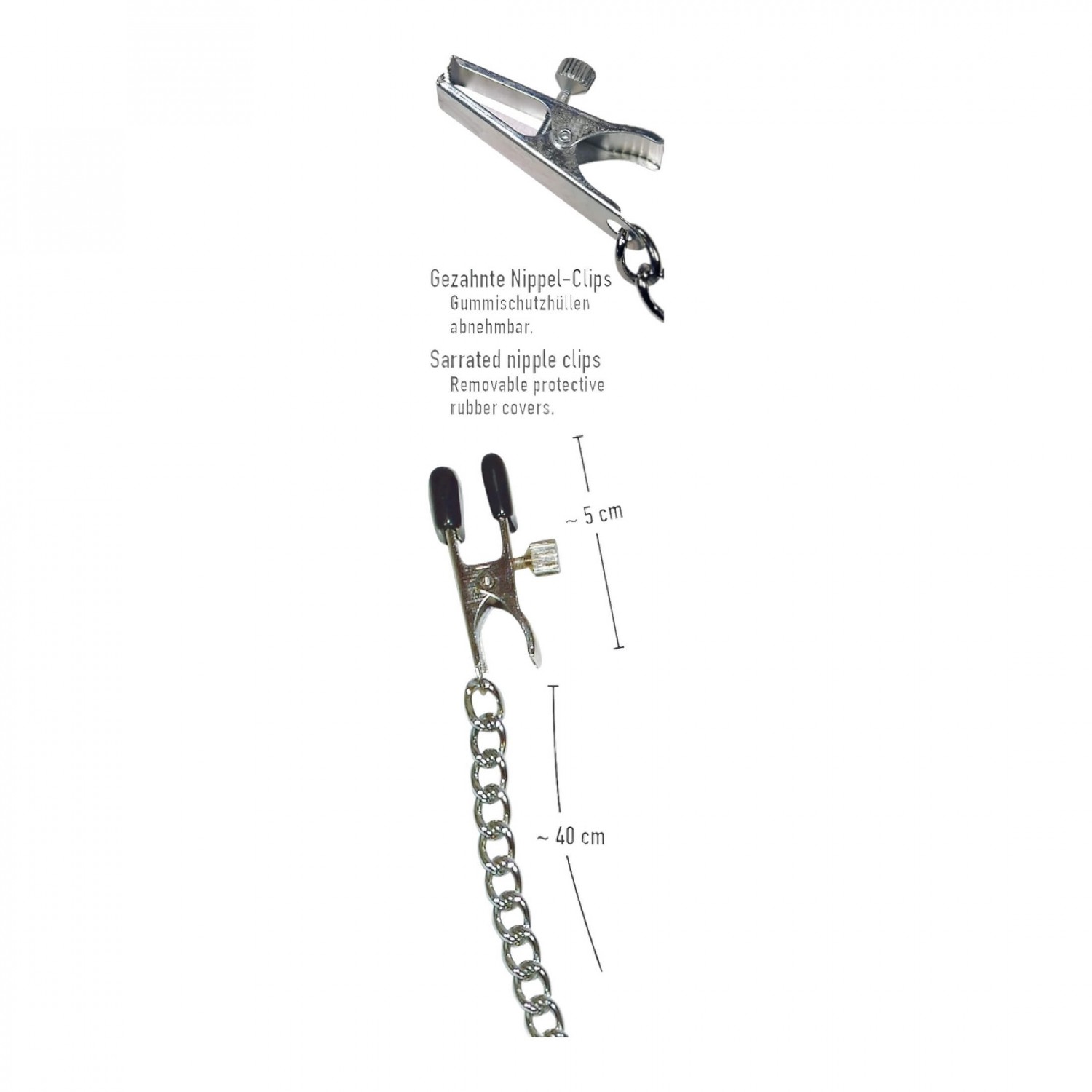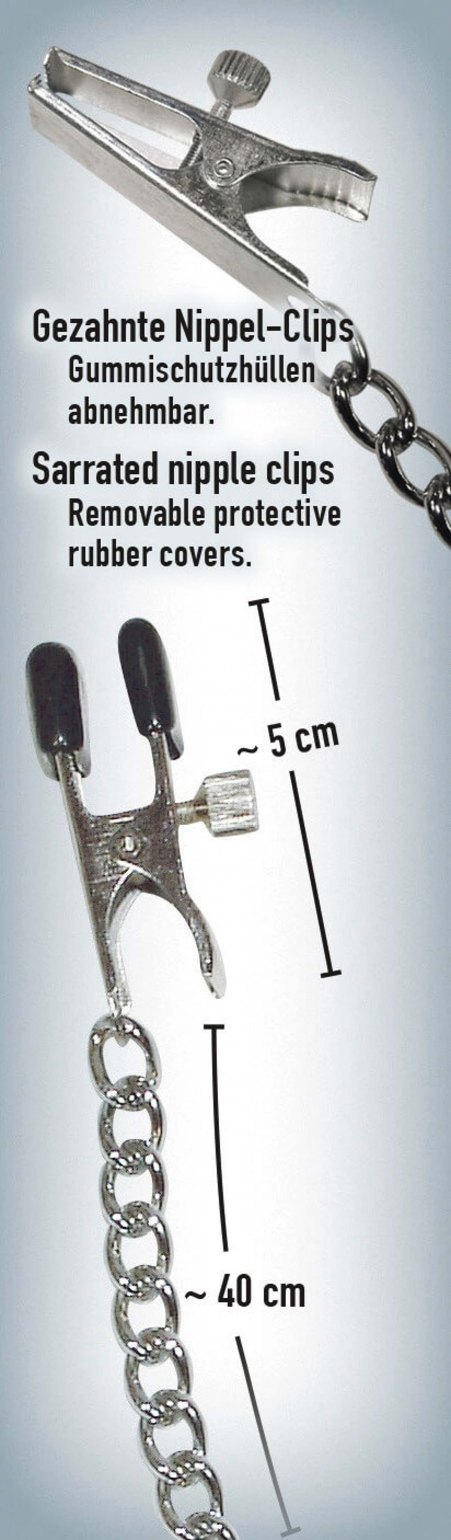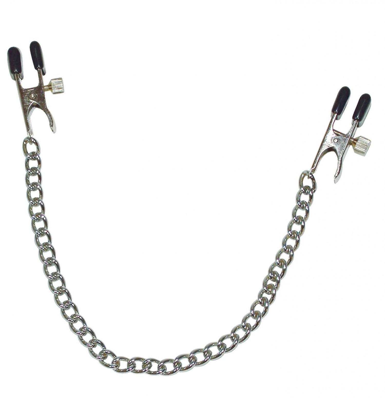 Impozáns lánc, mellbimbószorítóval! Ha kedveled az extrém kéjérzetet és a gyengéd fájdalmat, akkor ez fém bimbólánc sem hiányozhat a gyűjteményedből. Speciális, gumírozott csipeszekkel készült, melyek szorítási erőssége állítható. A csipeszek hossza egyenként kb. 5,5cm, szélessége 1,5cm. A lánc tömege kb. 70g. Anyaga: fém (allergénektől mentes).