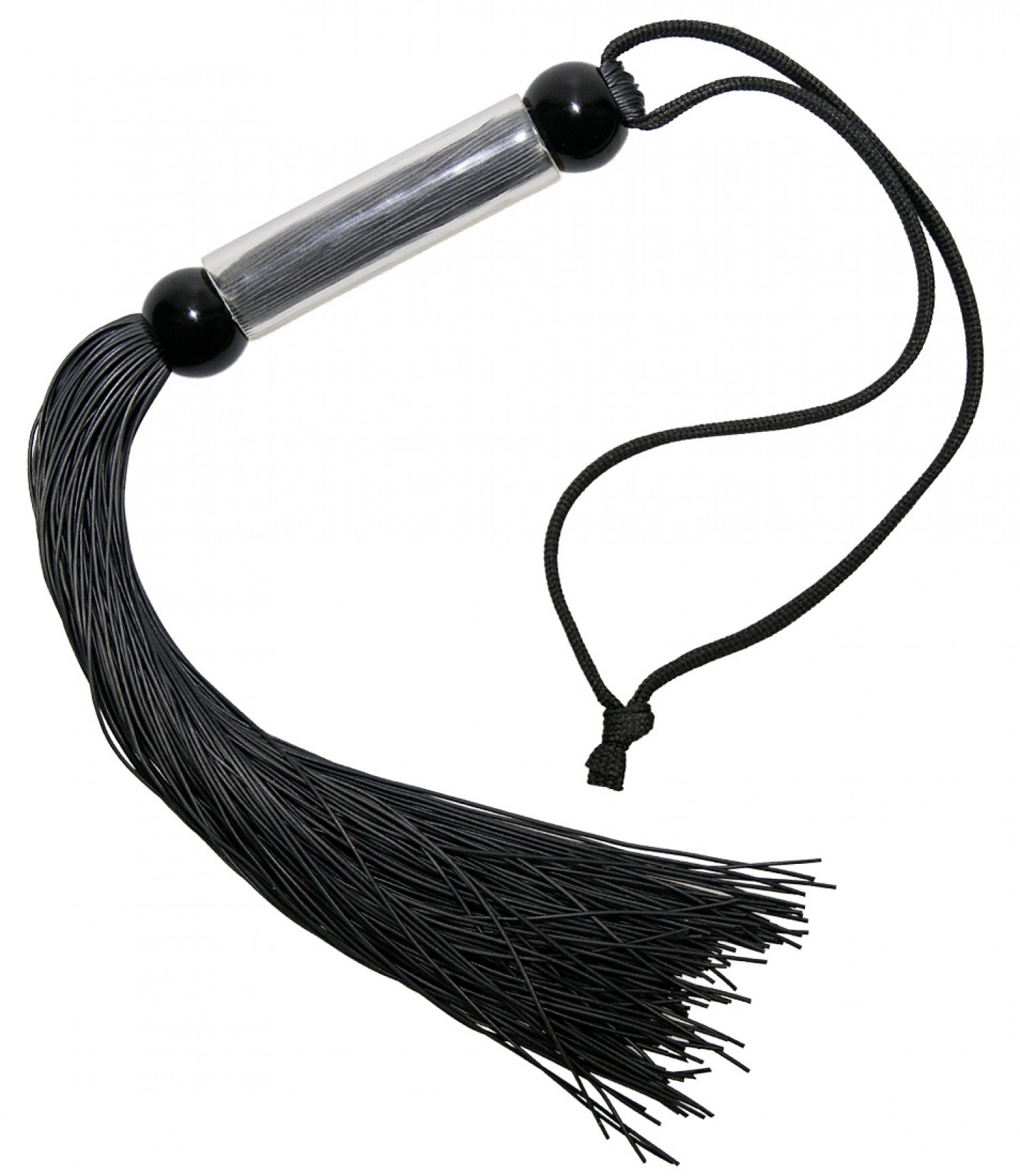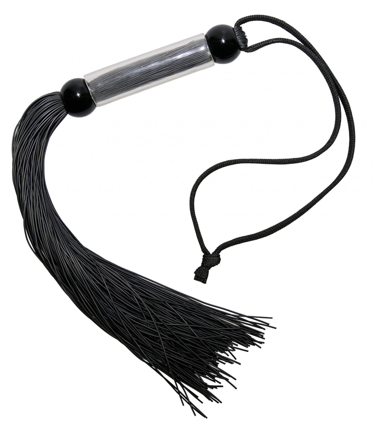 Kis méretű korbács csípős, fekete szilikonszálakból, műanyagból készült, dizájn-nyéllel és praktikus csuklópánttal. A kis fegyelmező teljes hossza 26cm.