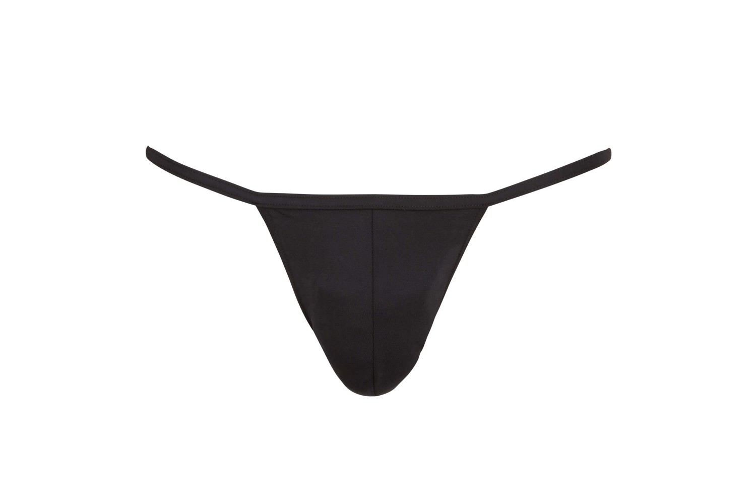 Rugalmas, fényes, fekete anyagból készült tanga, T-fazonban, elöl a férfiasságot kiemelő szabással.